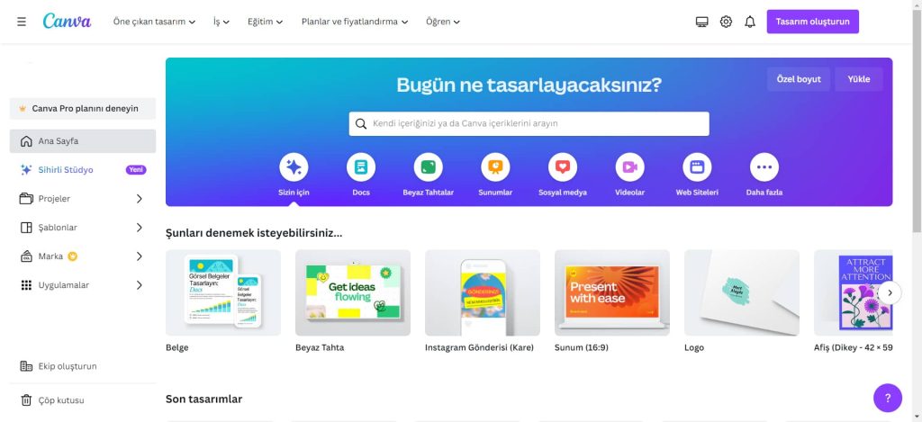 Canva Nedir? Canva, herkesin profesyonel düzeyde grafik tasarımlar oluşturabilmesi için tasarlanmış bir web tabanlı tasarım aracıdır. Kullanıcı dostu arayüzü ile bilinen Canva, broşürlerden sosyal medya gönderilerine, sunumlardan davetiyelere kadar geniş bir yelpazede tasarım yapmanıza olanak tanır.
