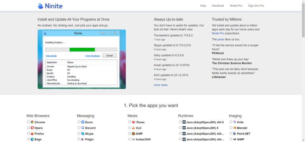 Ninite, kullanıcıların bir dizi yazılımı seçmelerine ve bu yazılımları tek bir kurulum paketi halinde indirmelerine olanak tanır. Bu, birden fazla programı ayrı ayrı indirip kurma zahmetinden kurtarır.