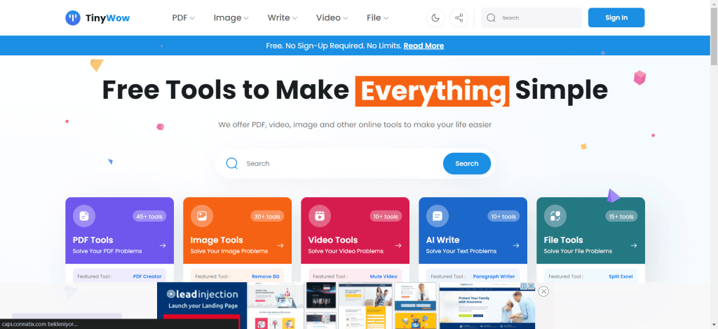 - Çeşitlilik: TinyWow, kullanıcıların PDF dosyalarını düzenlemelerine, resimler oluşturmalarına, videoları sıkıştırmalarına ve metinleri AI ile yazmalarına yardımcı olan çok sayıda araç sunuyor.